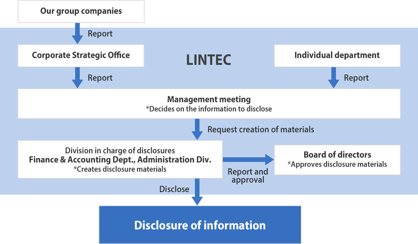 In this management meeting, all management information, internal and those related to our group companies, are reported by the directors of the Corporate Strategic Office and each department, and the important and useful information to be disclosed is decided. With this decision, the Finance & Accounting Dept. of the Administration Div. compiles the disclosure, creates the materials, and reports to the board of directors, and after being approved by the board, discloses the information.