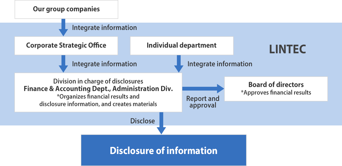 The financial results of LINTEC and our group companies are all integrated to the Finance & Accounting Dept. of the Administration Div., where disclosure materials on the financial closing and financial results are created based on the information.